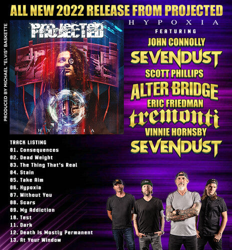 Vinyl LP pressing. Building upon the success of 2017's release Ignite My Insanity, rock and metal supergroup Projected release Hypoxia, the band's third studio album. It features 13 brand new songs from the heralded quartet consisting of Sevendust guitarist John Connolly, Alter Bridge/Creed drummer Scott Phillips, Sevendust bassist Vince Hornsby and Tremonti guitarist Eric "E-ROCK" Friedman.