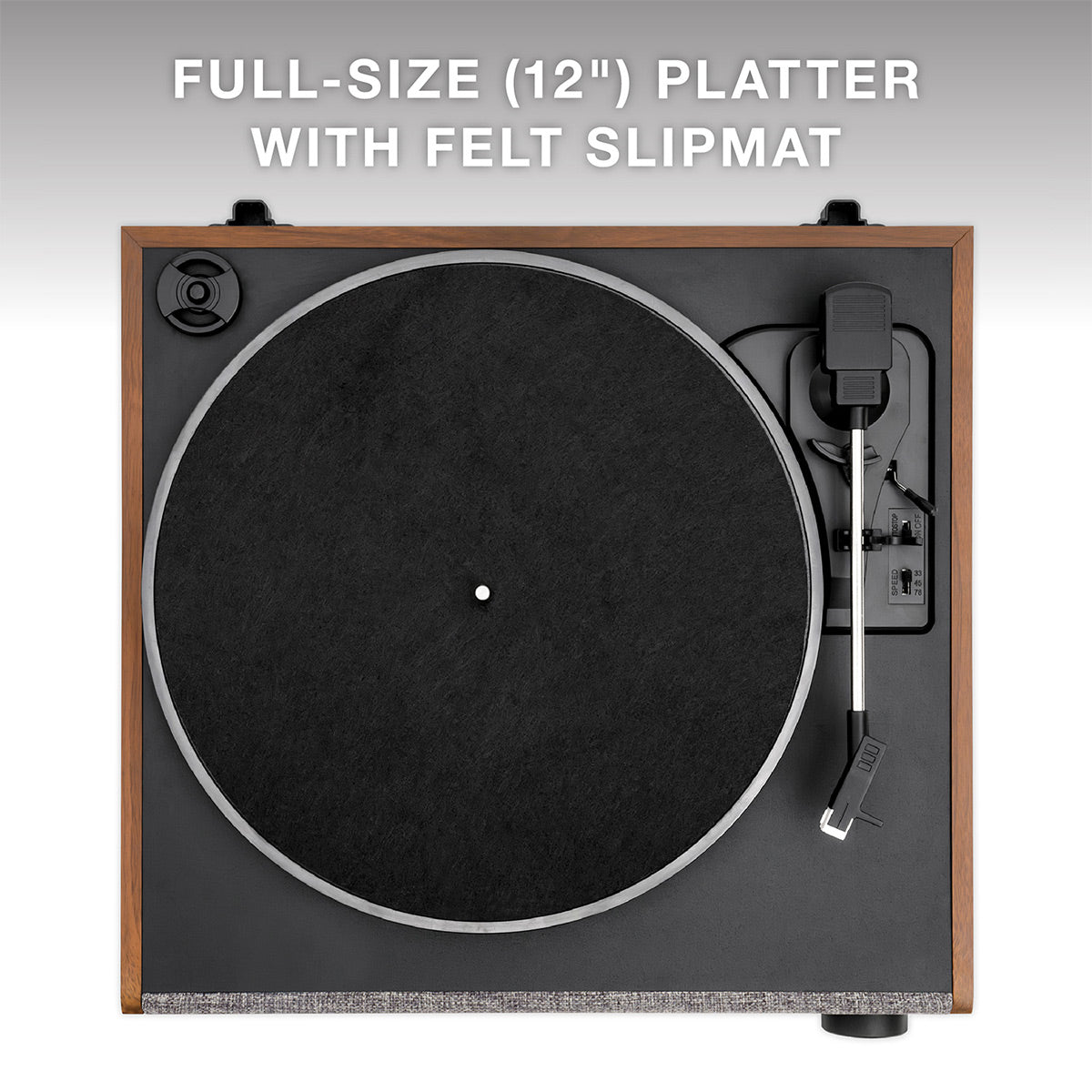 The Victrola Eastwood LP is the first full-size record player in the Eastwood lineup, serving up a 12-inch platter, more prominent speakers, and a stunning modern design. The Eastwood LP features a 3-speed, belt-driven turntable and a premium Audio-Technica AT-3600LA cartridge for superior tracking and sound quality. Listen to music from your smart device via Bluetooth®, or stream vinyl to any external Bluetooth speaker with Vinyl Stream Technology.